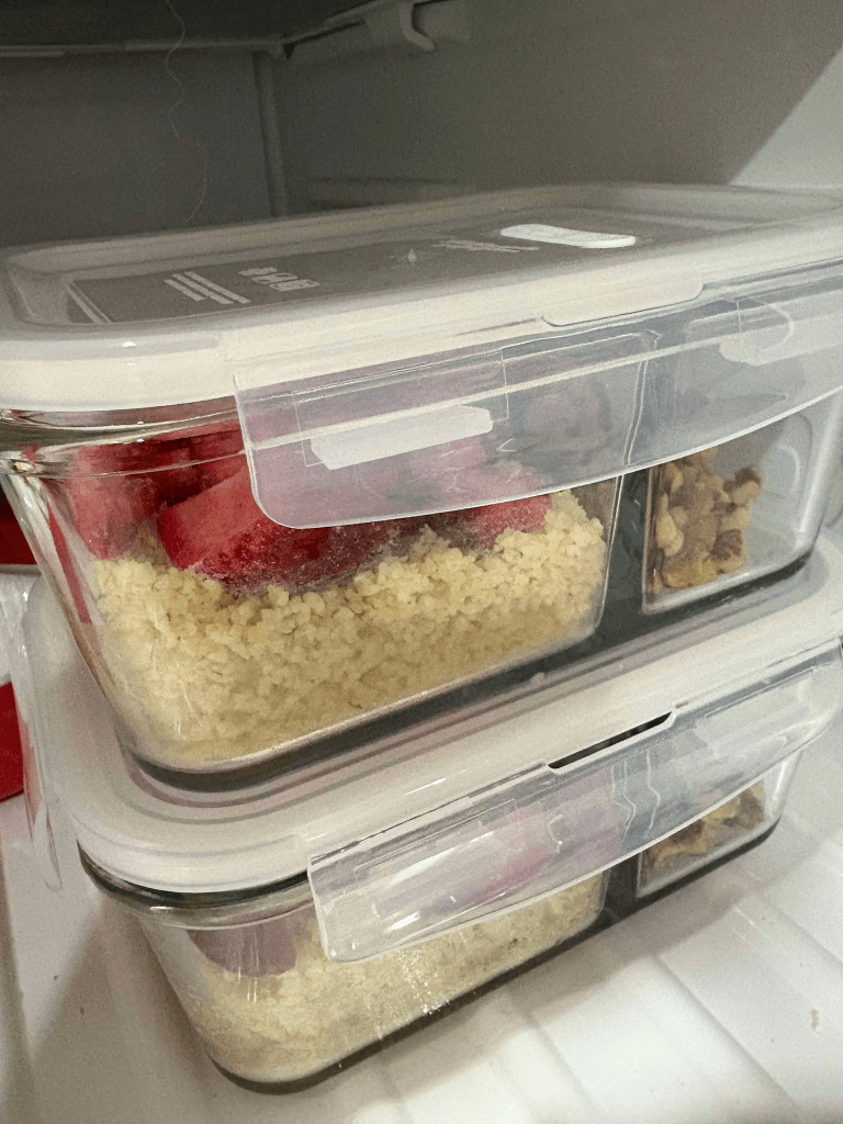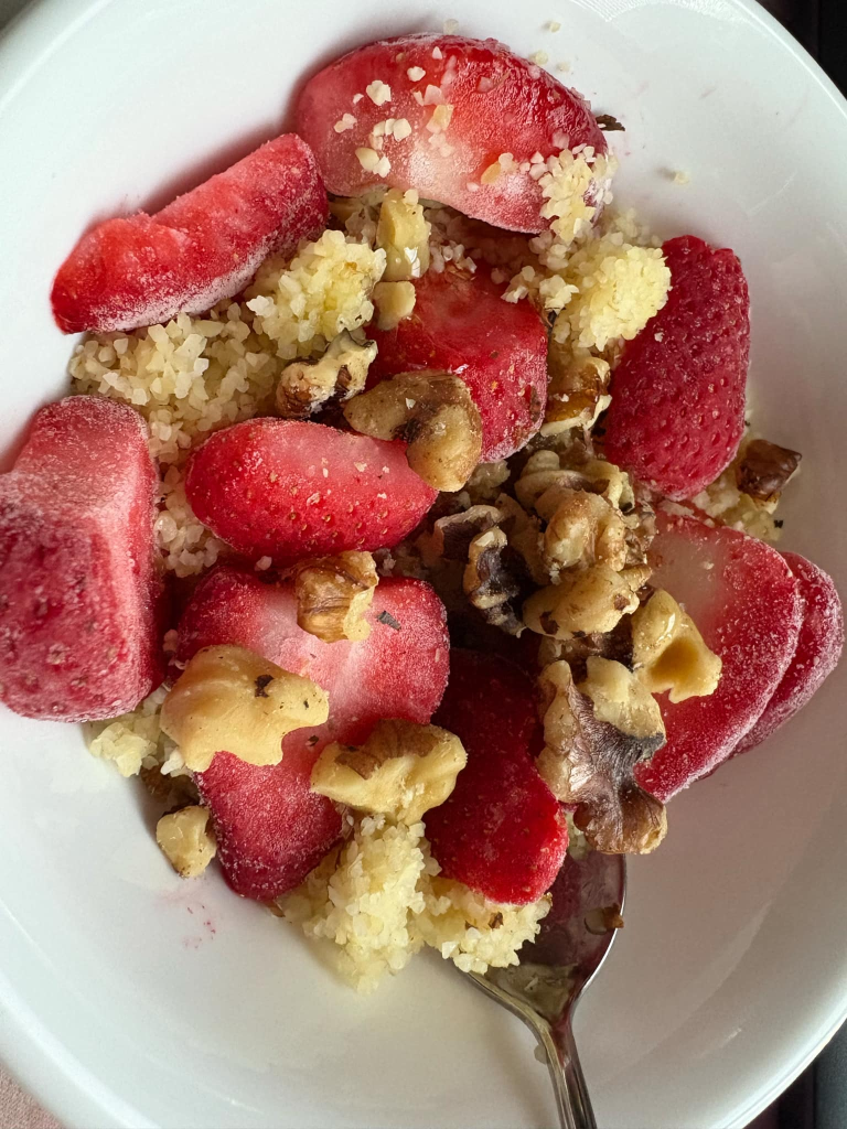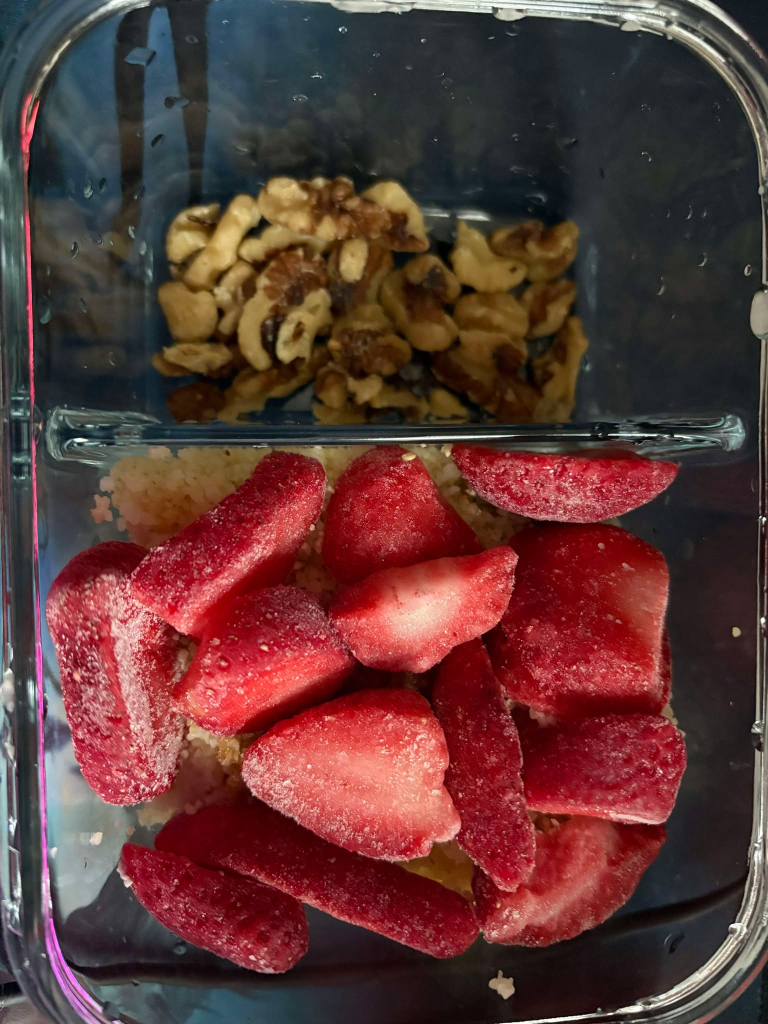 In this lovely bowl you will find – Bulgar, Frozen Strawberries (hello economy and cost effective), walnuts, a teaspoon of olive oil, a teaspoon of brown sugar.
