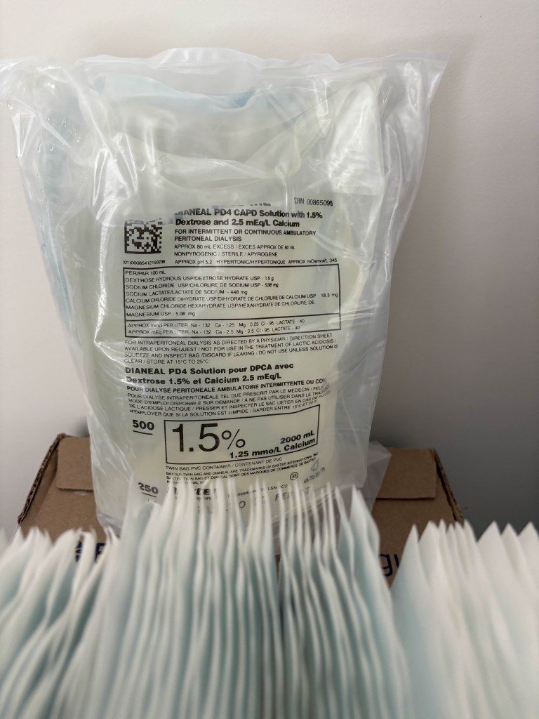 We fill with dialysis solutions – at 8:30am, 1:30pm, 6:30pm, and 10:30pm. Each fill requires a drain before we fill again. The fluid remains in his stomach for six hours. It absorbs the toxins and some of his nutrients from his stomach “sac” (the space within the stomach cavity). He cannot lift more than 15 lbs with the fluid in his stomach or he risks having a hernia. Eventually we will be trained on the cycler and he will do dialysis while he sleeps.